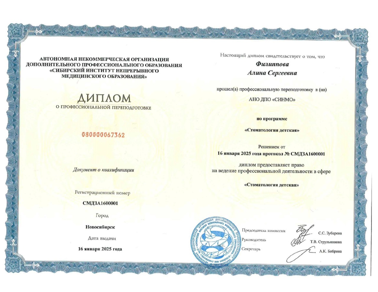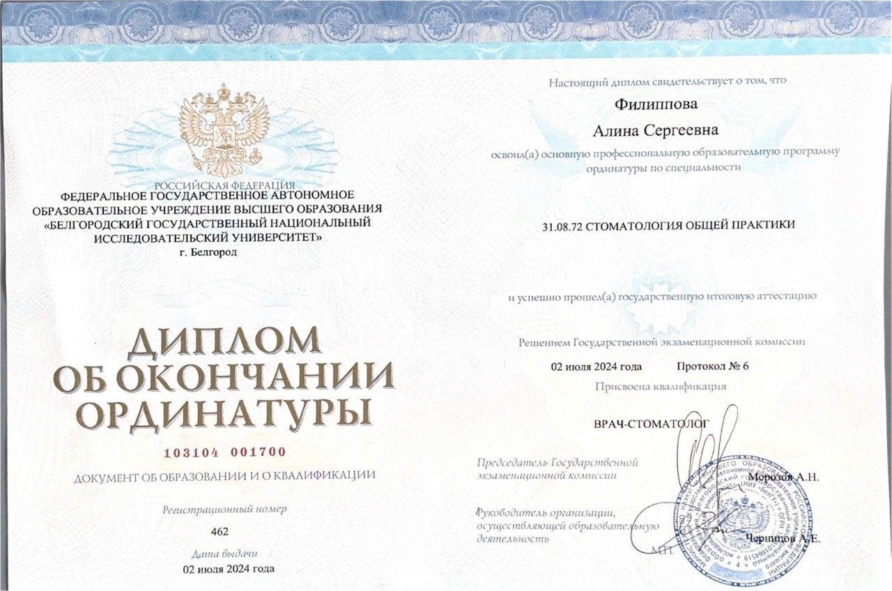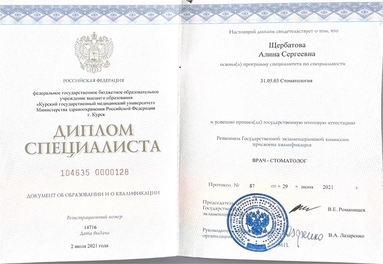 Диплом о высшем медицинском образовании по Специальности Стоматология